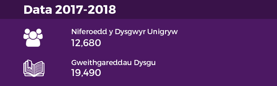 Yn 2017-2018 cymerodd y dysgwyr ran mewn o 19,490 o weithgareddau dysgu.