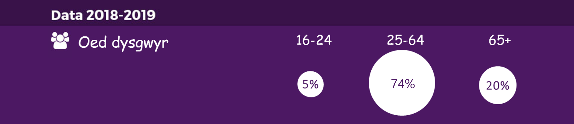 - Mae 10,555 o ddysgwyr 2018 - 2019 o fewn yr ystod oedran gweithio, 16-64 oed, sydd yn 80% o'r holl ddysgwyr.