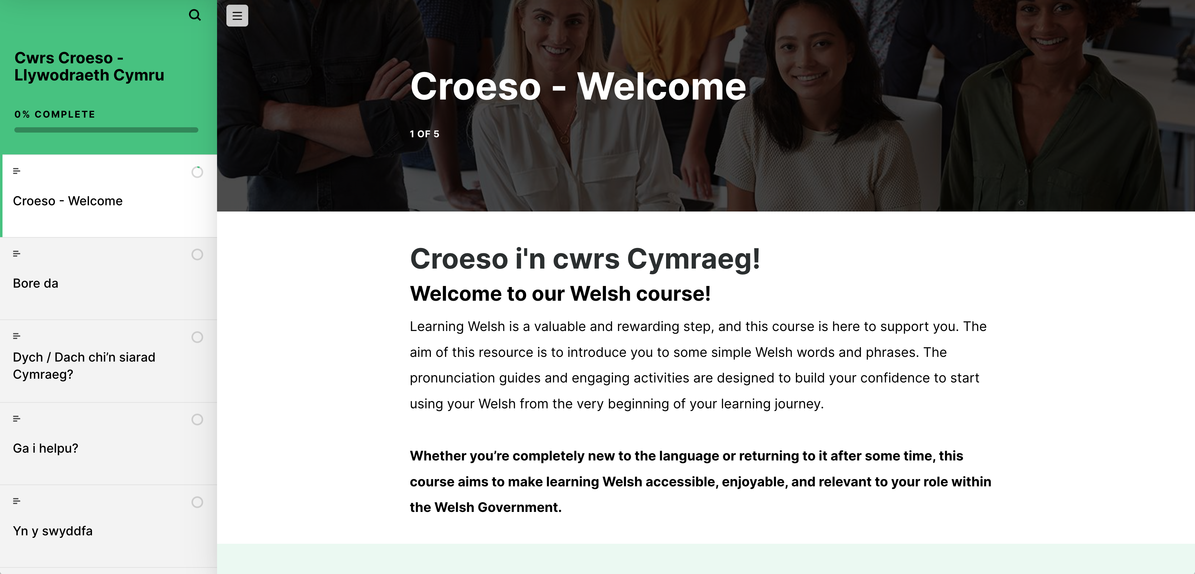 Croeso! Croeso i’n cwrs CROESO Cymraeg ar gyfer Llywodraeth Cymru. Mae’r rhaglen fer hon wedi’i chynllunio i gefnogi eich taith ddysgu ac i ddarparu ymadroddion ymarferol ar gyfer eu defnyddio yn y gweithle. Fel y nodir yn Cymraeg. Mae’n perthyn i ni i gyd, mae’r Gymraeg yn ased gwerthfawr i’n sefydliad ac yn rhan bwysig o’n diwylliant. Rydym yn annog pob cydweithiwr i fuddsoddi yn eu datblygiad a chryfhau eu sgiliau Cymraeg, beth bynnag fo’u man cychwyn.